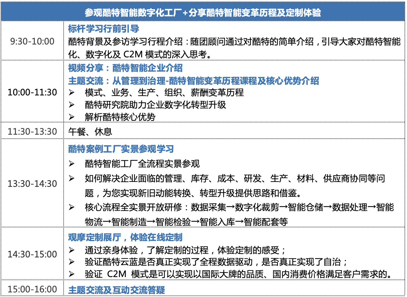 青岛酷特智能股份有限公司创建于1995年,在青岛生产经营高档西服、裤子、衬衣、休闲服及服饰系列产品。经过25年的探索,成功实践了C2M与IIM。CCTV新闻联播曾以《工业新亮点,传统制造业走向数据智能化》为标题,多次报道这家民营服装生产企业;海尔集团张瑞敏也曾亲率高管团队,7次走进酷特智能。