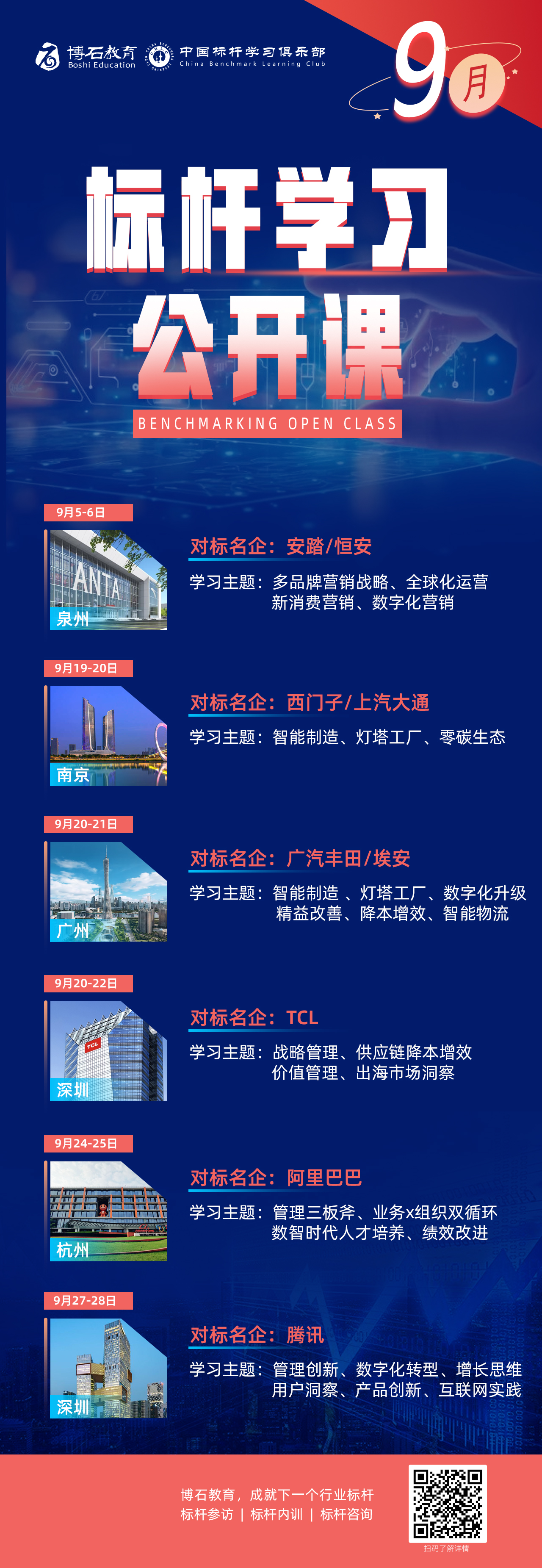 博石教育集团,对标学习专业机构。致力于帮助企业管理者提供对标学习与管理能力提升系统解决方案。公司产品以全球标杆企业学习互访为主导,以提供标杆学习系统解决方案为核心,建立了国内标杆学习高端社群——标杆学习俱乐部,标杆学习线上商学院——博石学堂,标杆学习高端智库——博石智库。公司立足北京总部,并在深圳、广州、杭州、青岛、美国、日本、德国等地设立有分子公司及办事处,每年在全球60多个城市举办各行业标杆企业学习课程和峰会500余场,累计服务企业6000多家,学员逾10万人,学员足迹遍布全球。