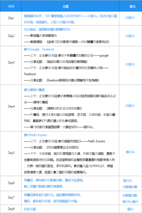 “ 科技创新所发挥的能效造福于人类,不仅仅改变了人们的生活方式,更重要的是实现了创业者的理想”。众所周知,美国是全球的科技创新领袖。近年来,美国实现了制造业的复兴,在推进智能制造和工业物联网应用方面取得了卓越成就,尤其智能硬件领域也正在蓬勃发展。而 Face- book、Google、微软、苹果等巨头也大举切入, 开启资本狂欢。基于此,我们组织学员到访全球科技创新的心脏 美国, 了解美国科技创新领头企业的运营模式,对话美国的知名科技创新领域的专家及企业高管,找出转型的关键点,探寻双方业务的生态合作机遇,启发学员开启国际前瞻视野和思考未来科技发展及应用的路径,为企业未來立下鸿图。